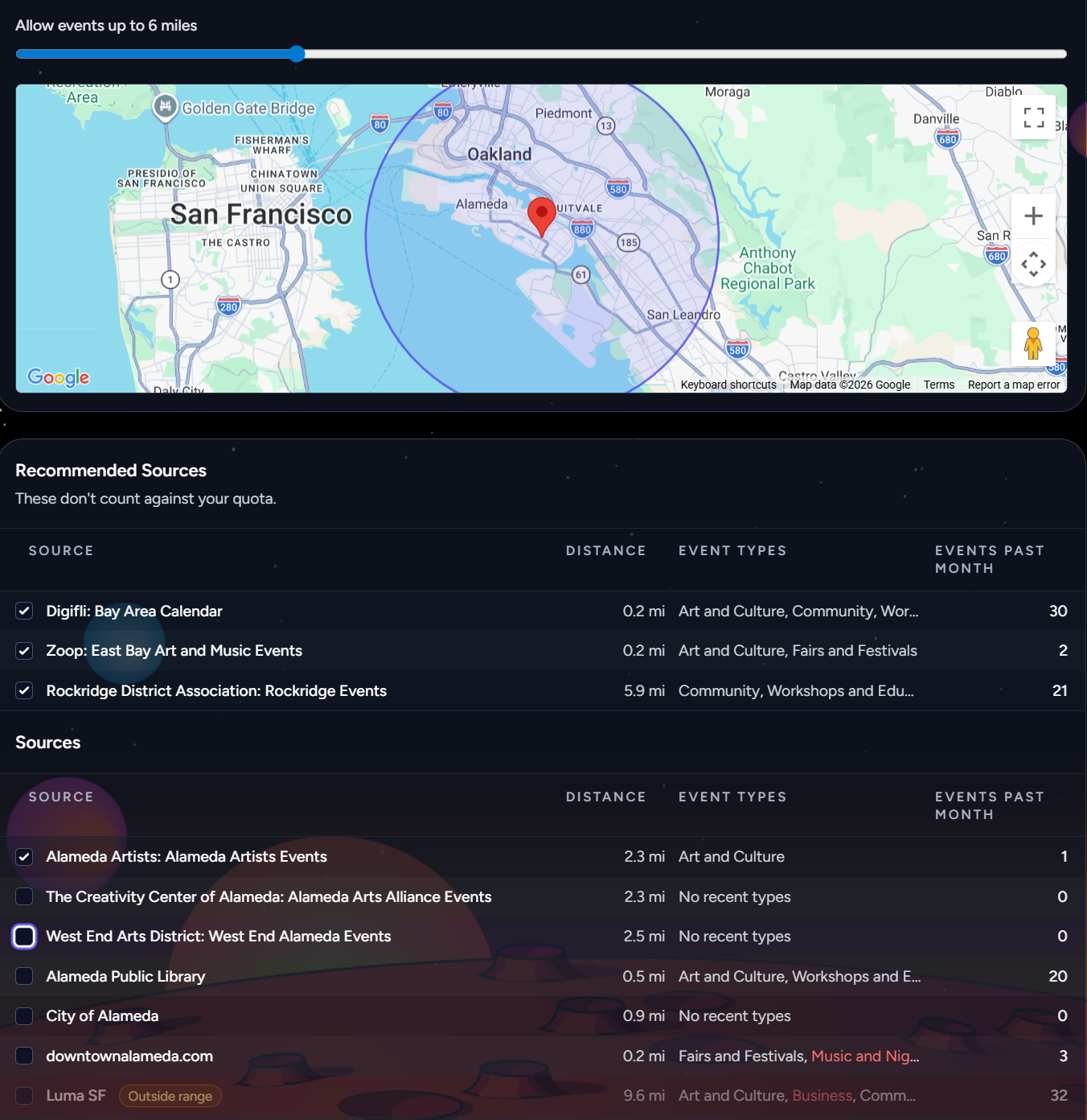 - Filter by distance, source, and category